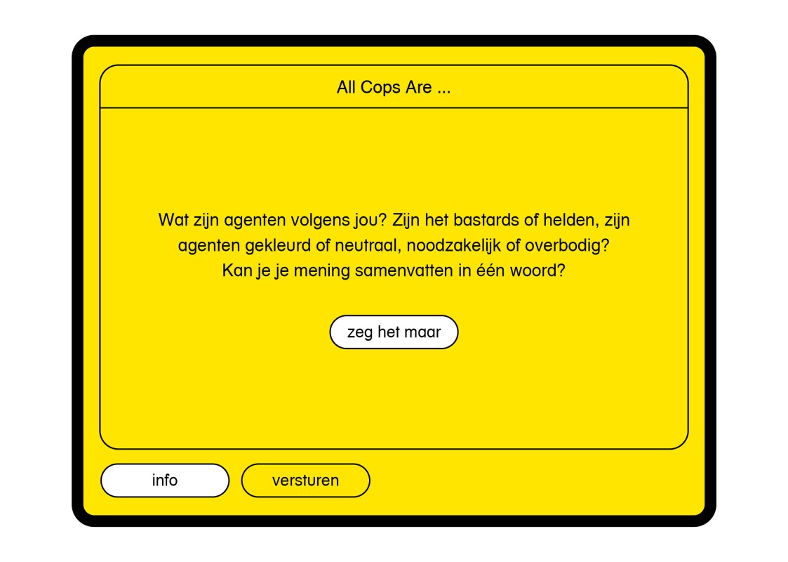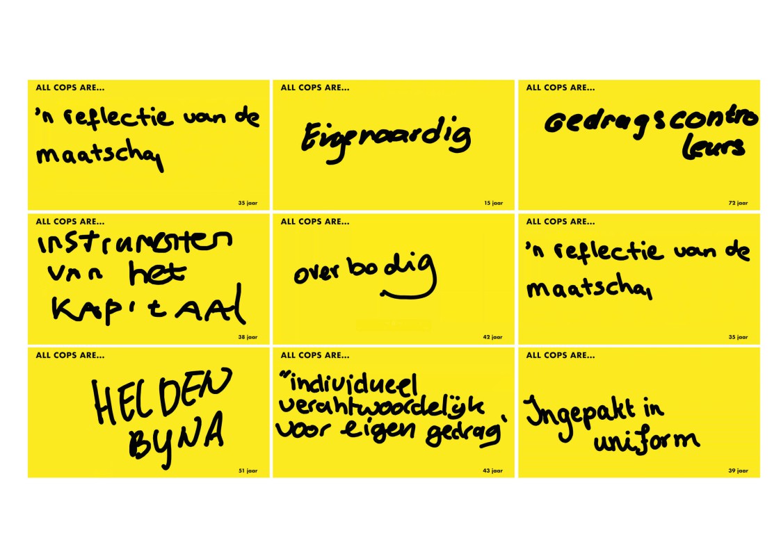 Naast deze fysieke versie van het kunstwerk heb ik samen met Yuri Veerman nagedacht over een geschikte manier voor het ophalen van reacties van het publiek. Waar in de video’s de stemmen je een indruk geven van de voorbijganger, is het bij de reacties het handschrift. Door mensen te vragen het acroniem “All Cops Are…” levert een simpele vraag veel inzichten op. is. De bezoeker schrijft het antwoord op en hier worden videobestanden van gemaakt. Het handschrift, de manier en het tempo van het schrijven zijn ook een soort stemmen en worden zo een nieuw onderdeel van de dialoog.